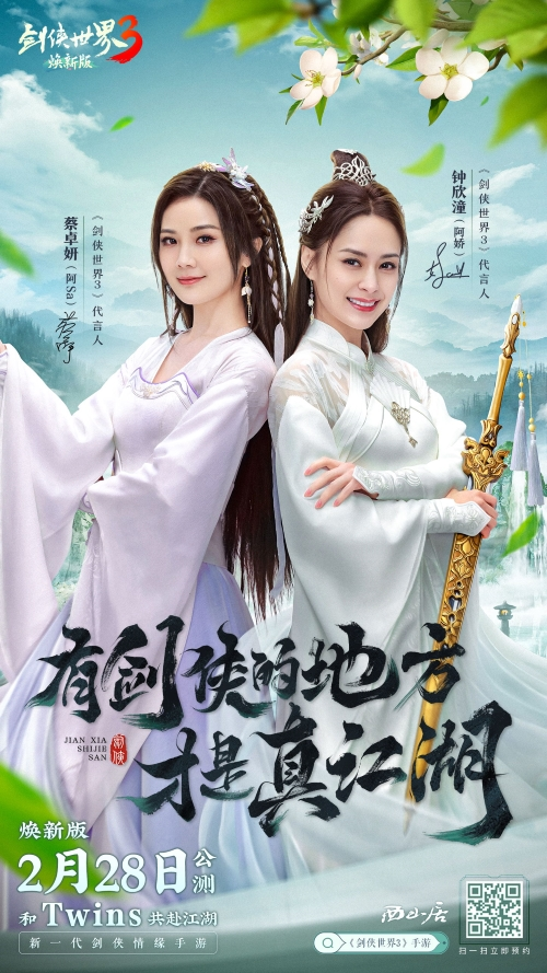 携手twins,共赴江湖。西山居新一代剑侠情缘手游《剑侠世界3》焕新版2月28日公测,今日正式官宣双明星组合twins为《剑侠世界3》品牌代言人!时隔12年,twins在剑侠江湖再度合体,她们又将会上演怎样荡气回肠的武侠故事?今日首曝阿sa阿娇绝美古装海报,且看蔡卓妍(sa)、钟欣潼穿越古今,演绎热血江湖中不变的真挚情谊!