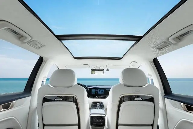 凯捷混动铂金版内饰设计源自现代建筑结构主义,优雅高级的“星月蓝白”配色,搭配座椅、门饰板等多处的玫瑰金嵌饰、专属“premium”金色logo,极尽每一处细节;更有超大尺寸全景天窗带来通透视野,塑造精致的轻奢氛围。
