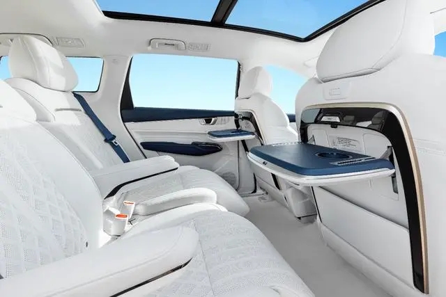 凯捷混动铂金版的航空级座椅,通过优异的人体工学设计,完美贴合人体腰、臀、肩的座椅曲线,采用纳米级科技亲肤面料,创新添加20mm舒适性海绵层,质感绵柔,透气又耐用;前排、二排座椅支持靠背180°电动放平,二排座椅还配有贴心的航空品质桌板、72°大开角独立电动腿托设计,让乘坐二排的家人可每时每刻享受spa级品质出行。