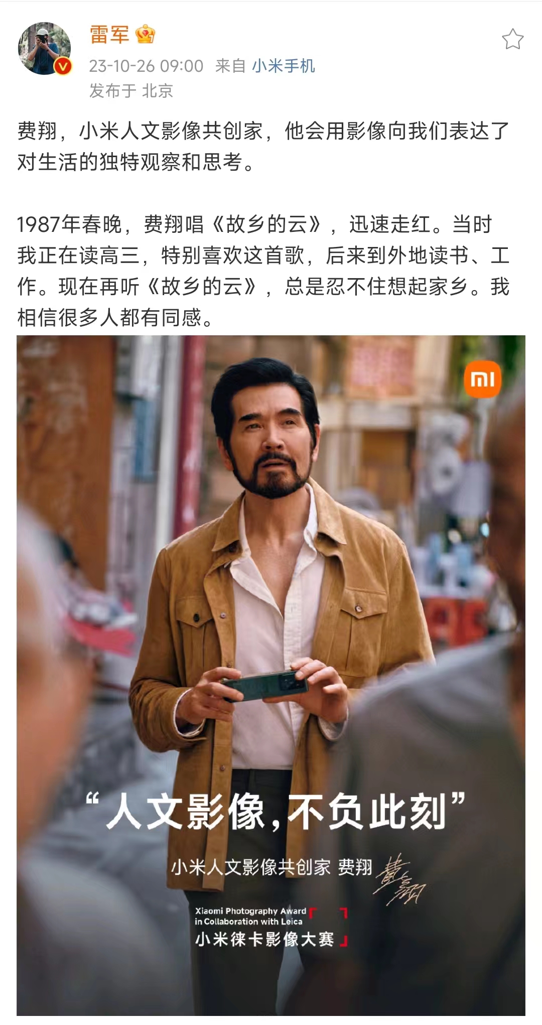 小米14系列手机将于10月26日晚7点发布,在正式亮相前,小米官方宣布费翔出任“小米人文影像共创家”。在此前的官微消息中,小米创办人雷军还曾透露,明年上半年,小米汽车将正式发布。随着谢霆锋、刘德华代言华为手机,费翔代言小米手机,请这些“老牌顶流”代言,似乎成了一种潮流。