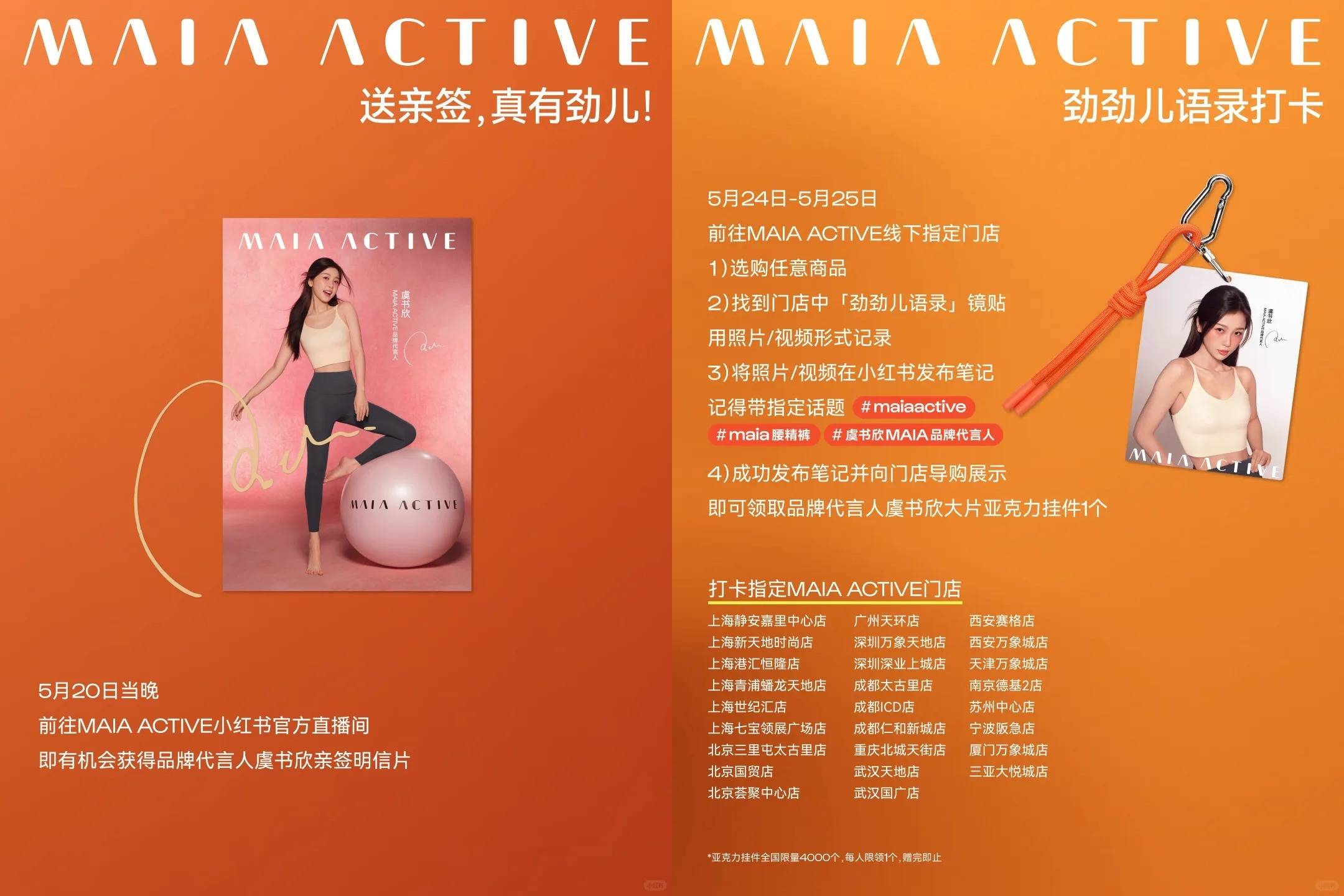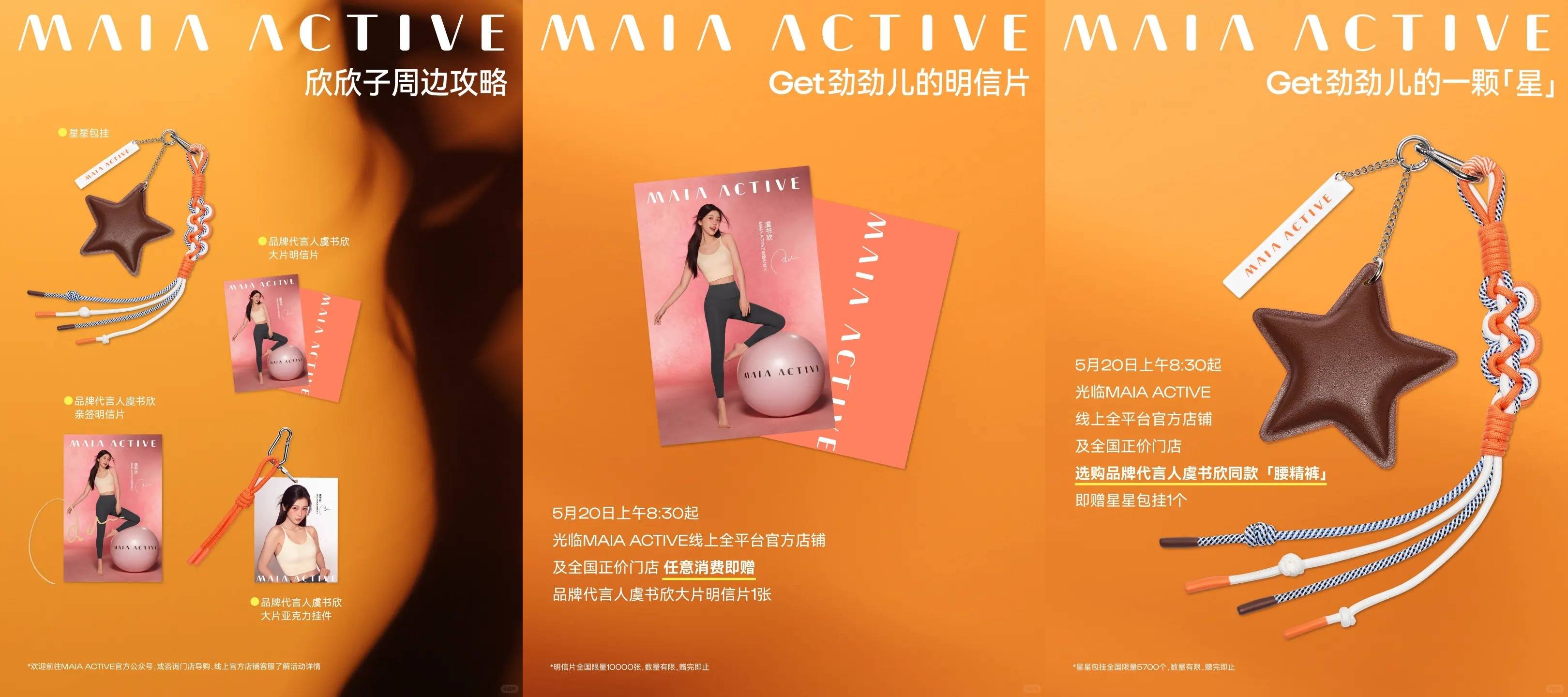 此外,5 月 20 日上午 8:30 起,光临 maia active 线上全平台官方店铺及全国正价门店,任意消费即赠品牌代言人虞书欣大片明信片 1 张,选购品牌代言人虞书欣同款「腰精裤」还将获得星星包挂 1 个,演绎有劲女孩就是闪亮的星!