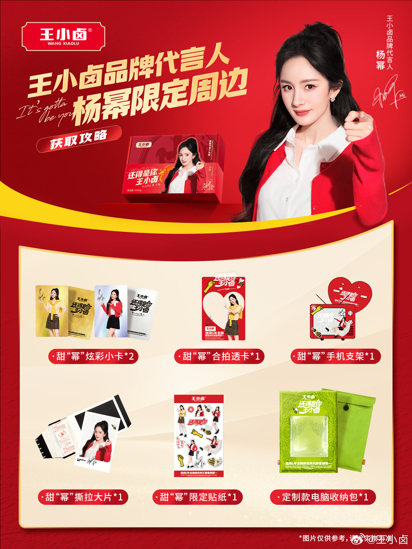 官宣当日,王小卤同步带来了杨幂 × 王小卤品牌代言人官宣限定礼盒。礼盒内除了含有多款王小卤的当家产品之外,还有小卡、透卡、撕拉片、电脑收纳包等多款代言人周边,陪大家「爪」住快乐「幂」方。