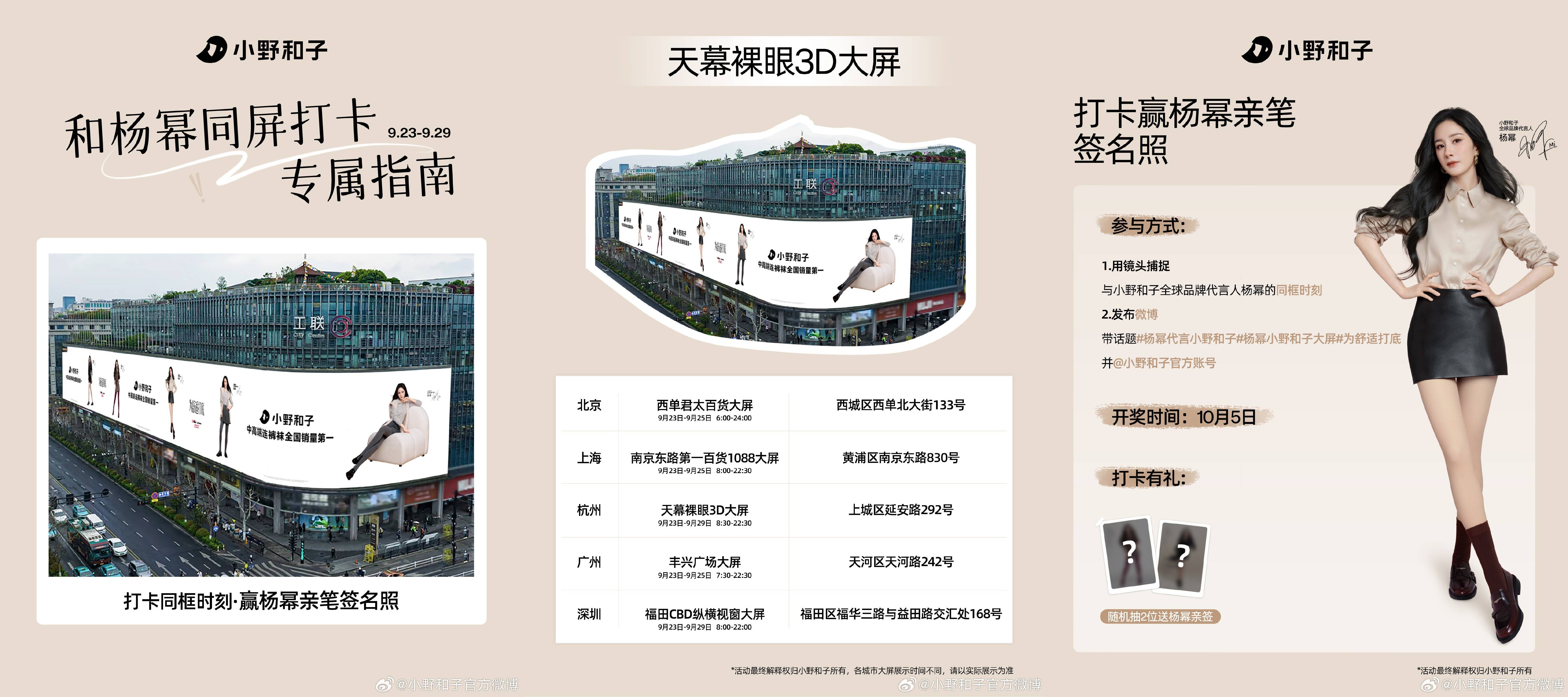 9 月 23 日,小野和子官宣杨幂(明星代言公司)为全球品牌代言人。双方将继续以中国文化为根基,将功能与美感设计结合,让衣服成为身体与意志的宣言,此次联动,双方将共同推出限定礼盒,包括代言人小卡、明信片、贴纸、万年历、冰箱贴等多款周边。不仅如此,品牌还将举办线下打卡活动,用镜头捕捉与杨幂及小野和子的同框时刻即有机会获得代言亲签,一起为舒适打底,解锁百搭灵感。