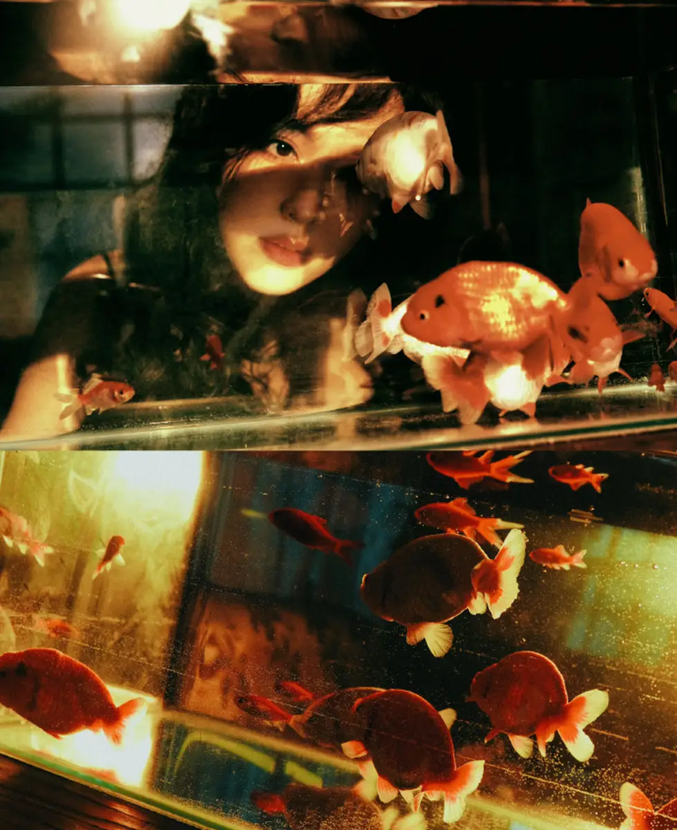 唐嫣看鲤鱼,表情温柔。