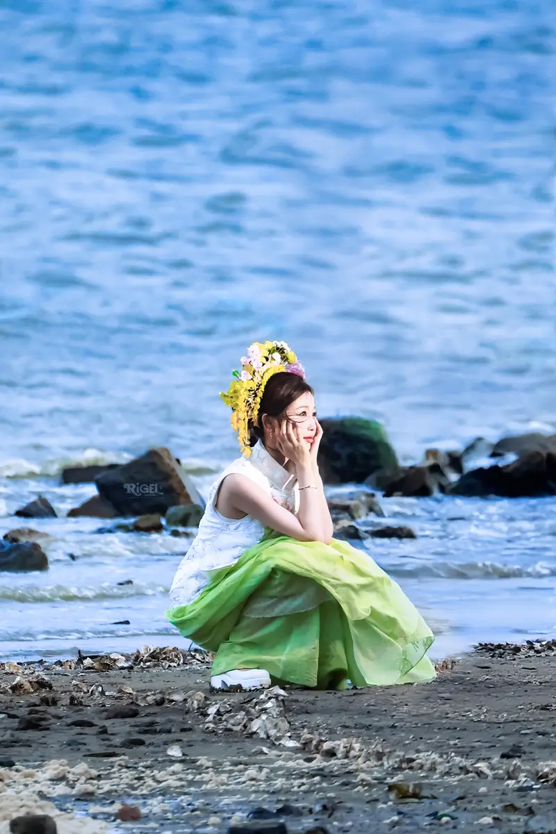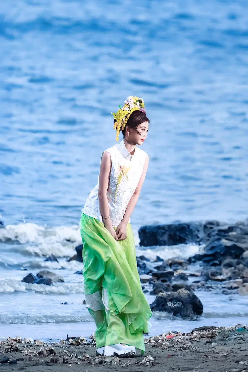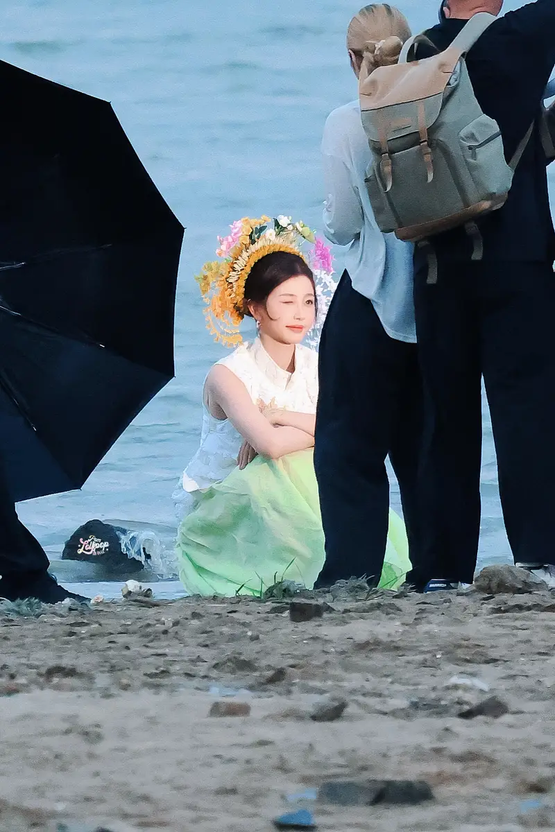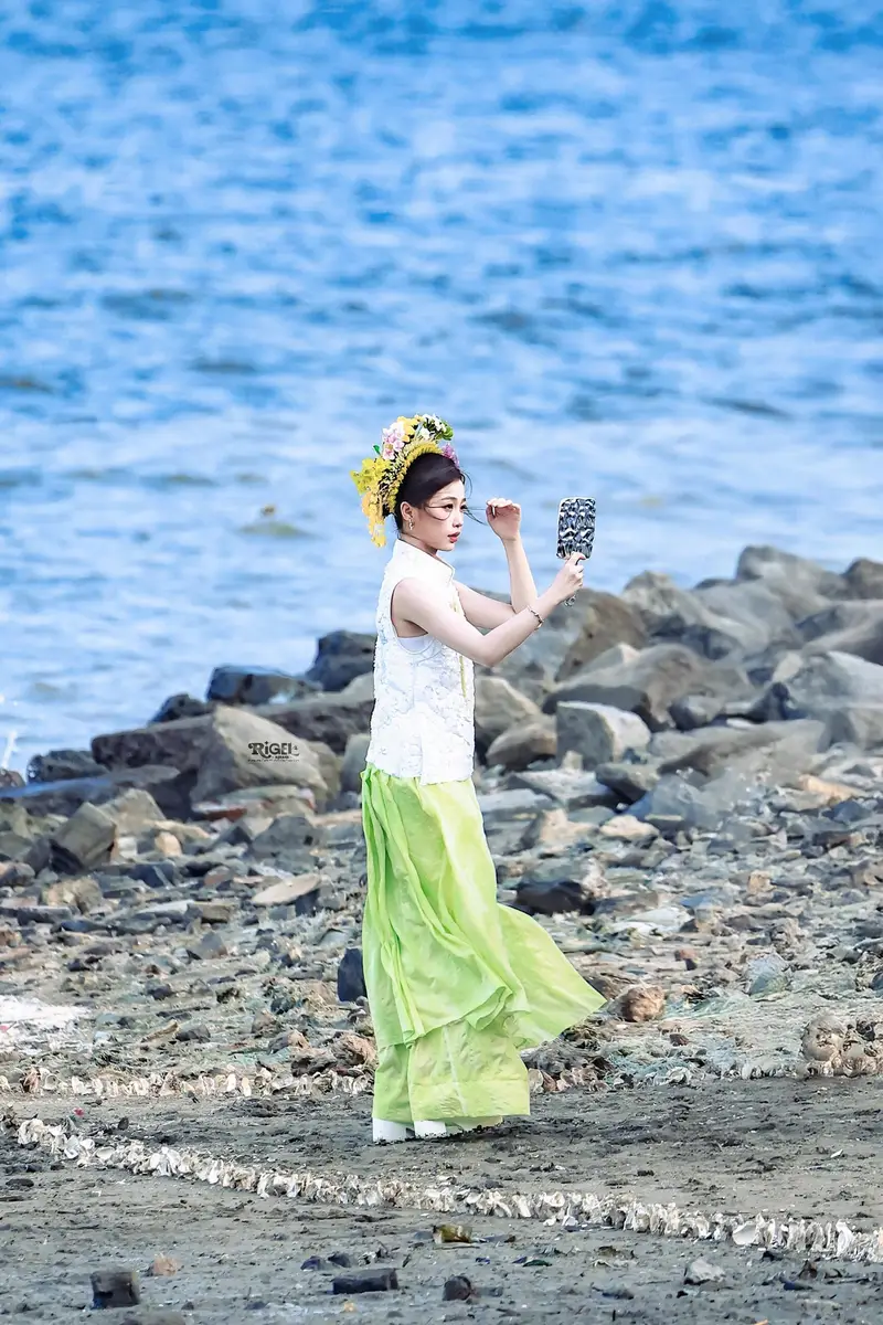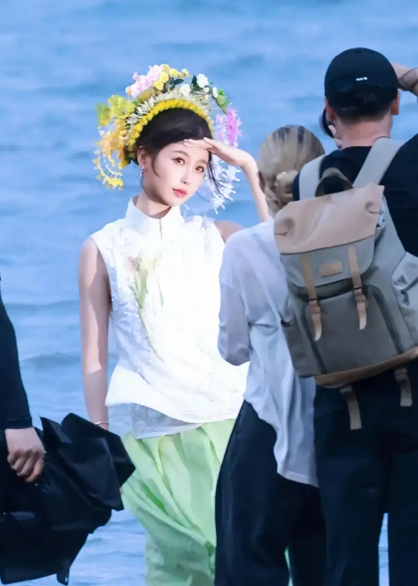 7月4日,虞书欣在拍摄新剧时的一组路透曝光,照片里的她穿新中式白色上衣搭配绿色裙子,清新自然,海边簪花明媚娇艳。