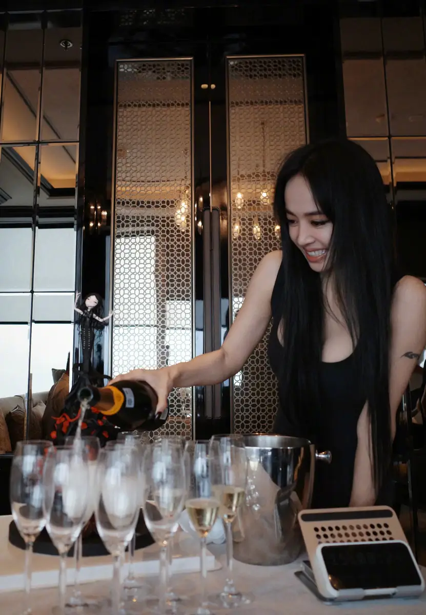 蔡依林喝香槟庆祝,心情大好。