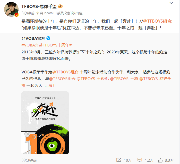 易烊千玺官宣tfboys十年之约。