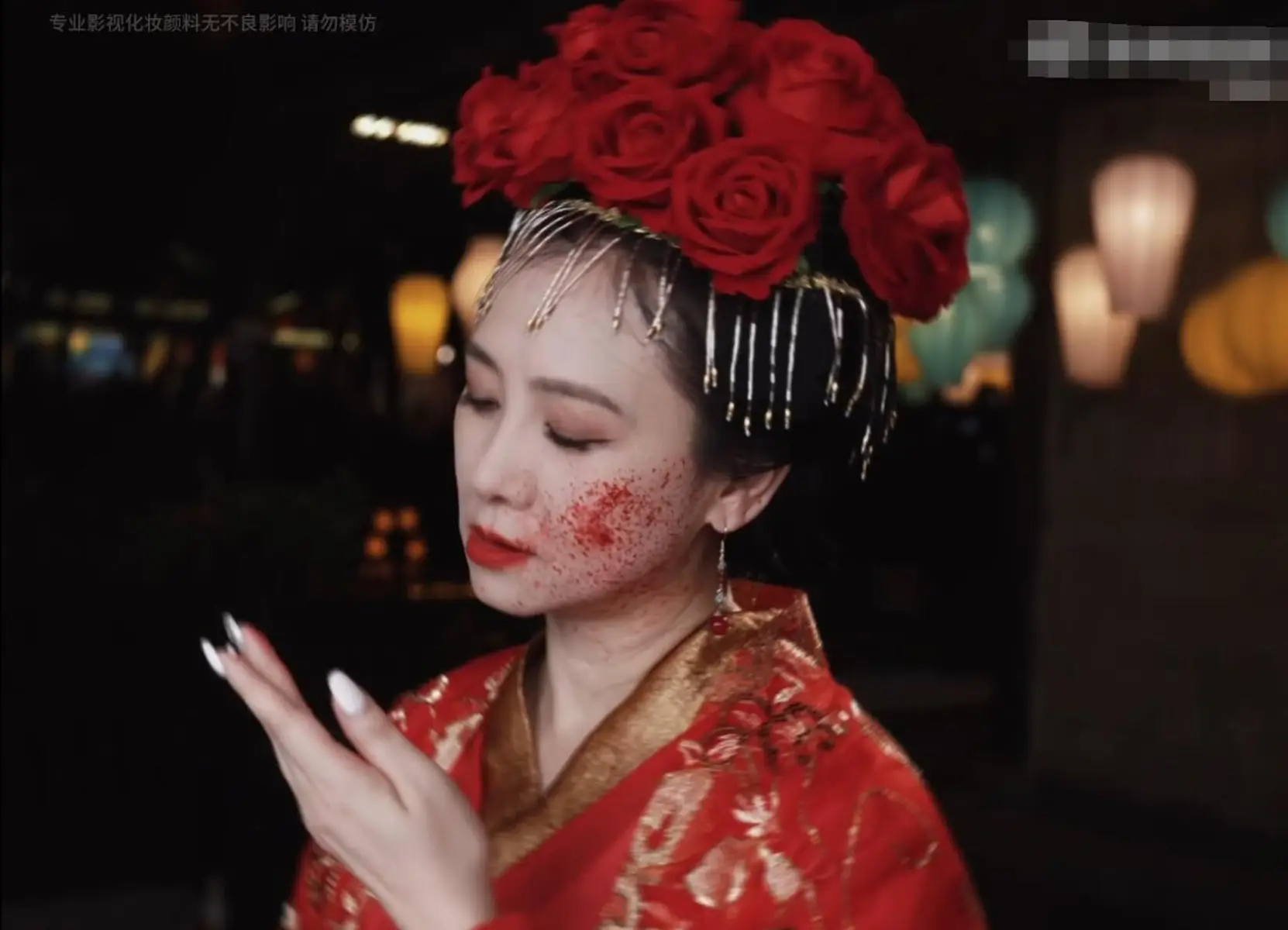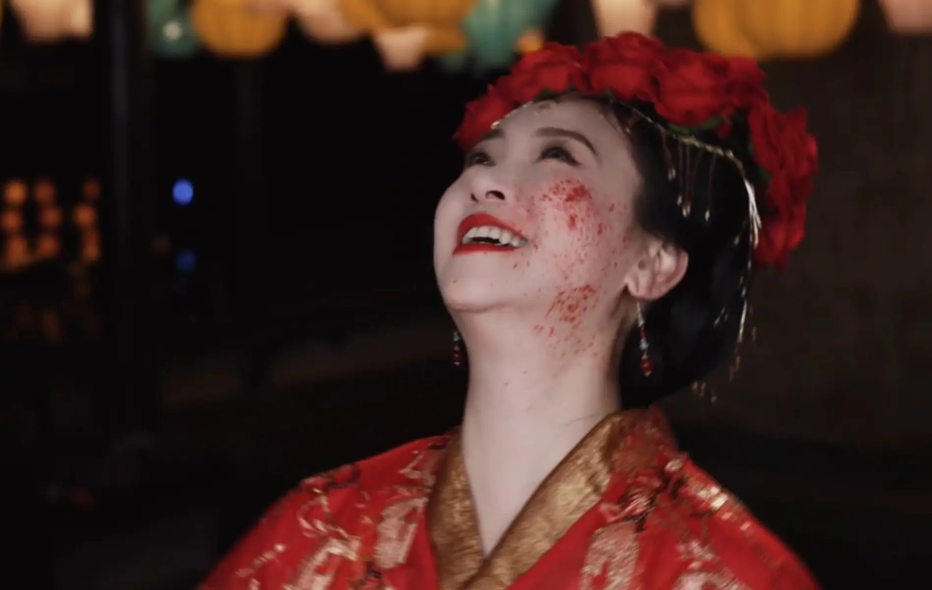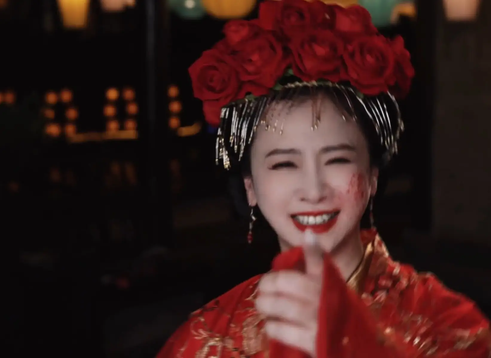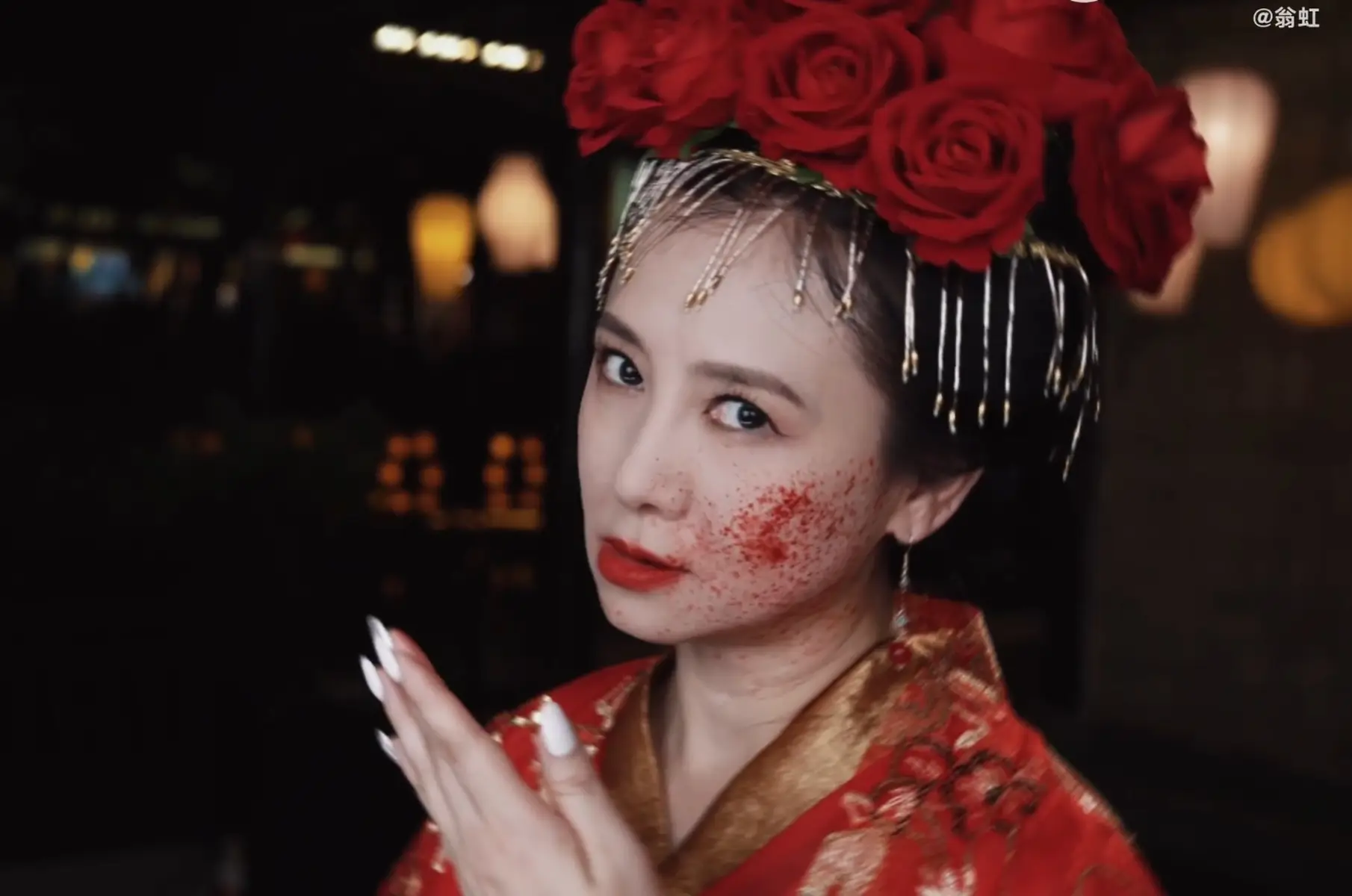 翁虹开怀大笑,搭配脸上的血迹,笑容邪魅,有种鬼新娘的感觉。