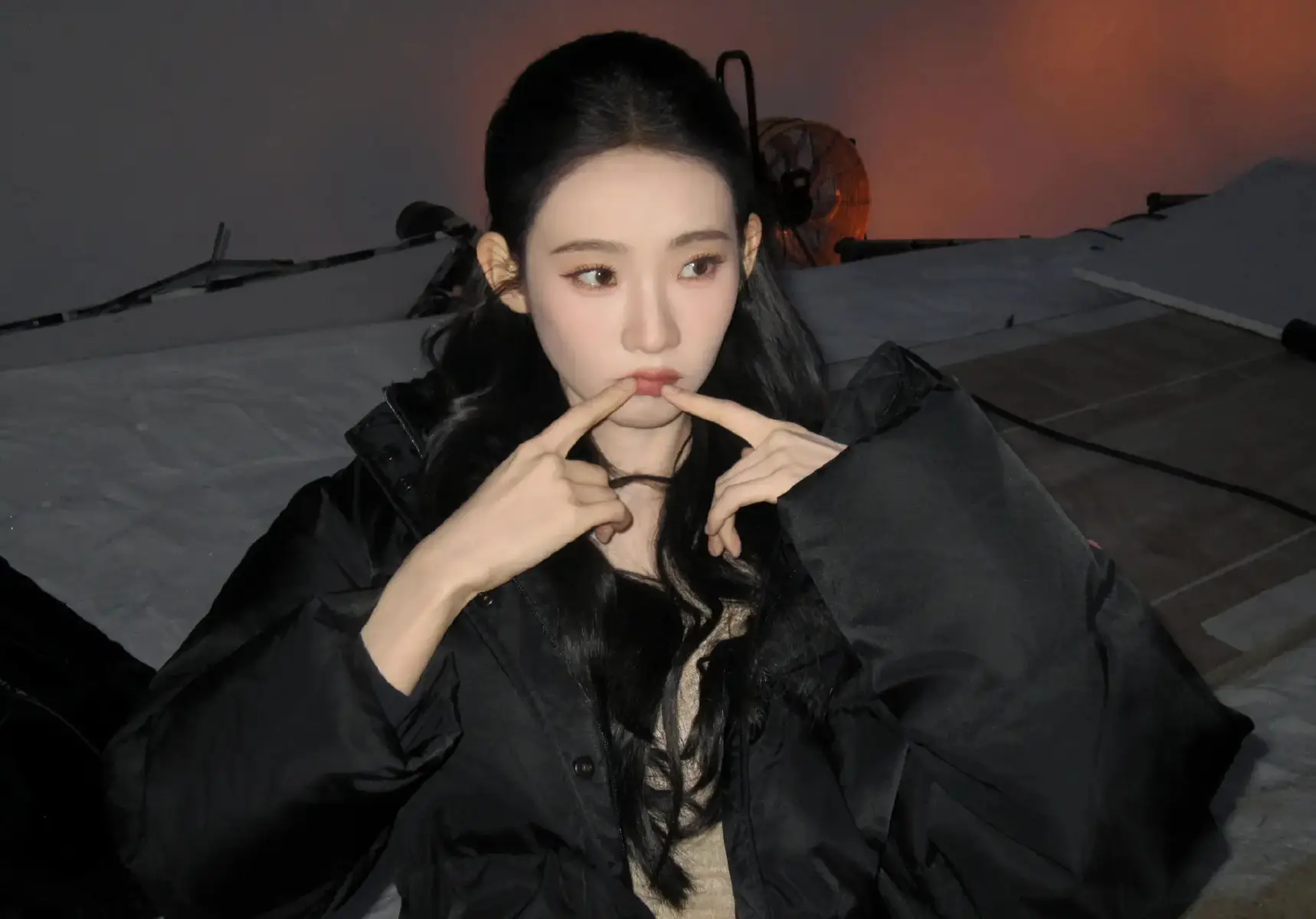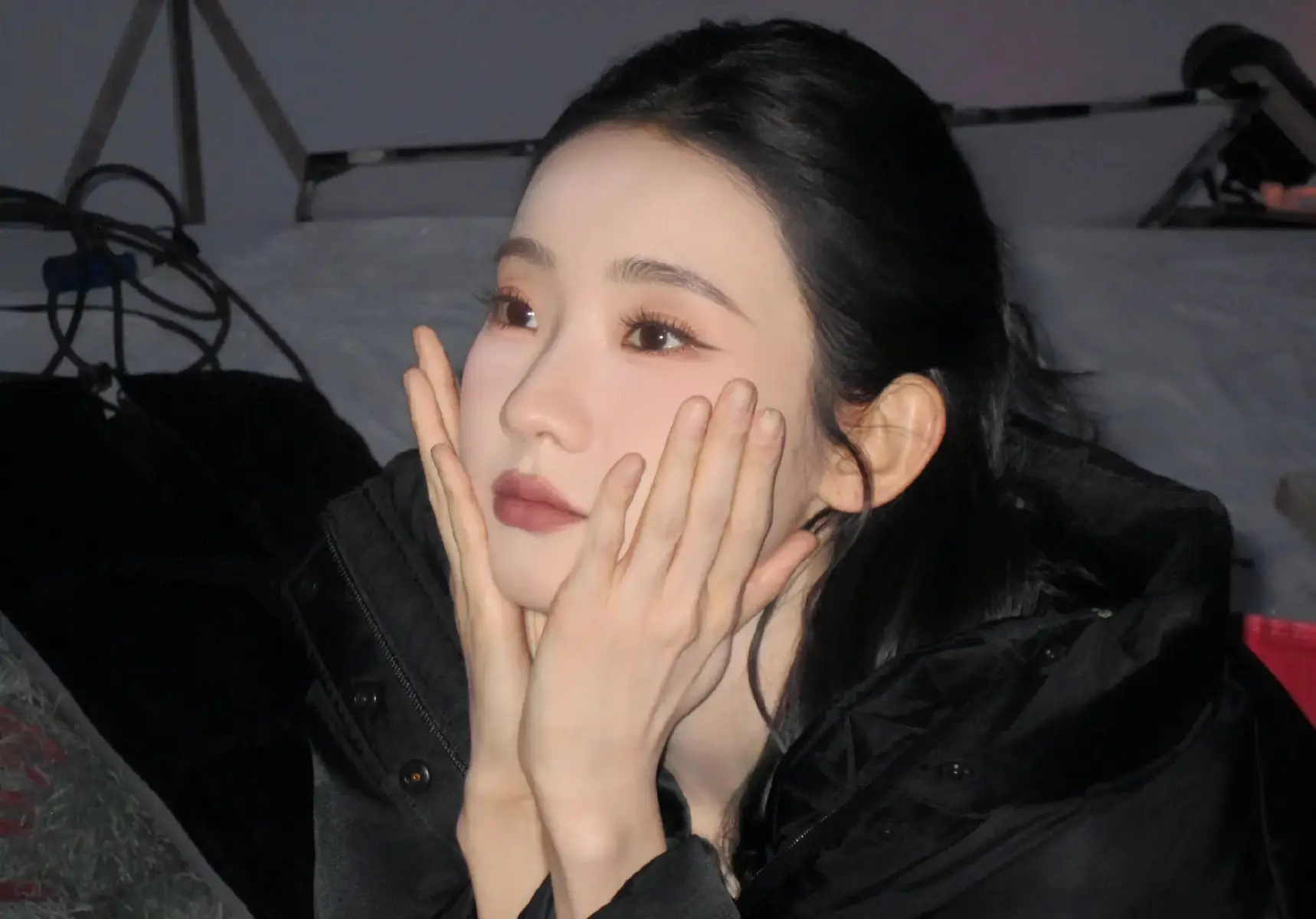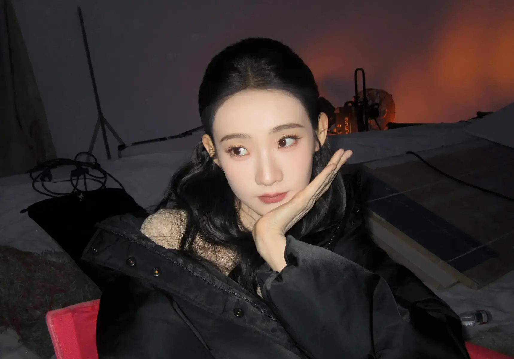 张艺凡托腮卖萌,黑羽绒服软萌可爱。
