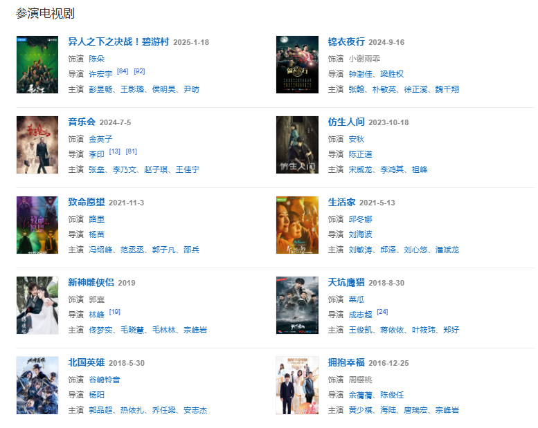 代表作品:嘉年华、血观音、天坑鹰猎、心理罪之城市之光、淑女之家、酷爸俏妈、雪女王、一帆风顺、妈妈!、仿生人间、异人之下之决战!碧游村、想飞的女孩